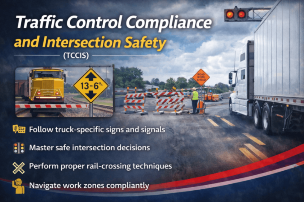Intersections, signals, and work zones are among the most complex and high-risk environments a commercial driver encounters. The Traffic Control Compliance and Intersection Safety (TCCIS) course is designed to equip CDL drivers with the knowledge, judgment, and discipline required to navigate these areas safely, legally, and with full regulatory compliance.